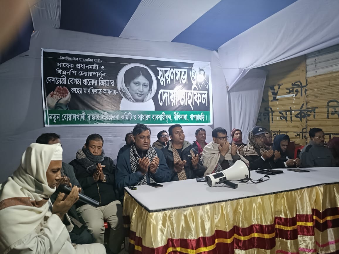 খাগড়াছড়ির দীঘিনালা উপজেলার বোয়ালখালী নতুন বাজারে সাবেক প্রধানমন্ত্রী ও বিএনপি চেয়ারপার্সন দেশনেত্রী বেগম খালেদা জিয়ার রুহের মাগফিরাত কামনায় স্মরণসভা ও দোয়া মাহফিল অনুষ্ঠিত হয়েছে।