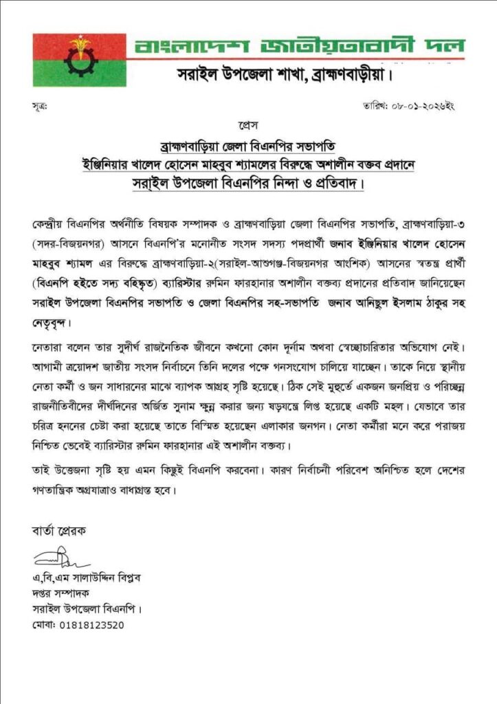 বিএনপির কেন্দ্রীয় কমিটির অর্থনীতি বিষয়ক সম্পাদক ও জেলা বিএনপির সভাপতি ইঞ্জিনিয়ার খালেদ হোসেন মাহবুব শ্যামলকে নিয়ে অশালীন ও কুরুচিপূর্ণ বক্তব্য দেয়ায় বিএনপি থেকে সদ্য বহিষ্কৃত নেত্রী ত্রয়োদশ জাতীয় সংসদ নির্বাচনে ব্রাহ্মণবাড়িয়া-২ আসনের স্বতন্ত্র প্রার্থী ব্যারিস্টার রুমিন ফারহানার বক্তব্যের নিন্দা ও প্রতিবাদ জানিয়েছে সরাইল উপজেলা বিএনপি।