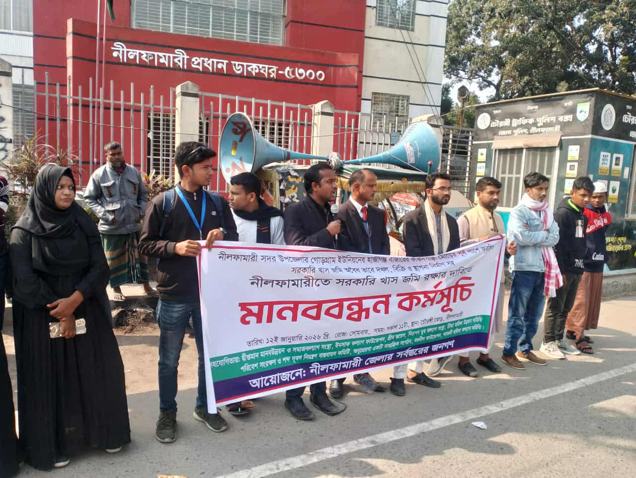 সোমবার (১২ জানুয়ারি) সকাল ১১টায় নীলফামারী চৌরঙ্গী মোড়ে এ কর্মসূচি অনুষ্ঠিত হয়। মানববন্ধনে শতাধিক সাধারণ মানুষ, সামাজিক সংগঠনের প্রতিনিধি ও সচেতন নাগরিকরা অংশগ্রহণ করেন। কর্মসূচি শেষে গণস্বাক্ষর সংগ্রহ করা হয় এবং অবৈধ দখল উচ্ছেদ ও দোষীদের বিরুদ্ধে ব্যবস্থা গ্রহণের দাবিতে অতিরিক্ত জেলা প্রশাসক (রাজস্ব) মো. সাইদুল ইসলামের কাছে স্মারকলিপি প্রদান করা হয়।