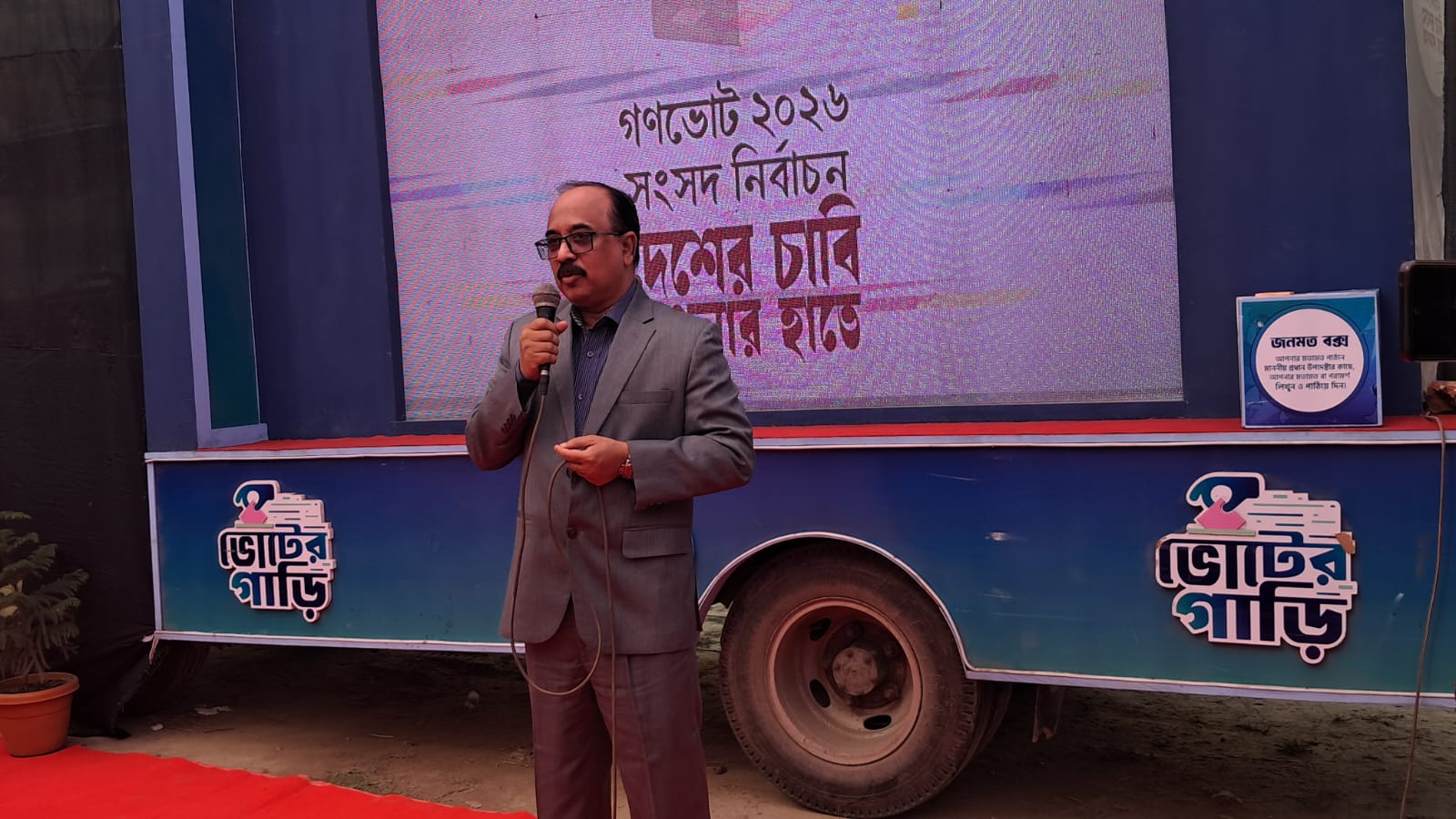 রাজবাড়ীর গোয়ালন্দে ত্রয়োদশ জাতীয় সংসদ নির্বাচন ও গণভোটের গুরুত্ব তুলে ধরতে ভোটের গাড়ির প্রচারণার উদ্বোধন করেছেন, ঢাকা বিভাগের বিভাগীয় কমিশনার শরফ উদ্দিন আহমেদ চৌধুরী।