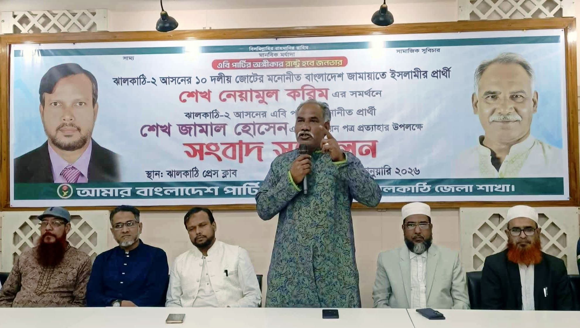 সংবাদ সম্মেলনে এবি পার্টির মনোনয়ন প্রত্যাহার করা প্রার্থী শেখ জামাল হোসেন বলেন, “আমার বাংলাদেশ পার্টি ১০ দলীয় জোটের সঙ্গে যুক্ত হয়েছে। জোটগত সিদ্ধান্তের প্রতি সম্মান জানিয়ে আমি ঝালকাঠি-২ আসনে আমার প্রার্থিতা প্রত্যাহার করছি এবং জামায়াতে ইসলামীর মনোনীত প্রার্থী এস এম শেখ নেয়ামুল করিম ভাইকে পূর্ণ সমর্থন দিচ্ছি।”