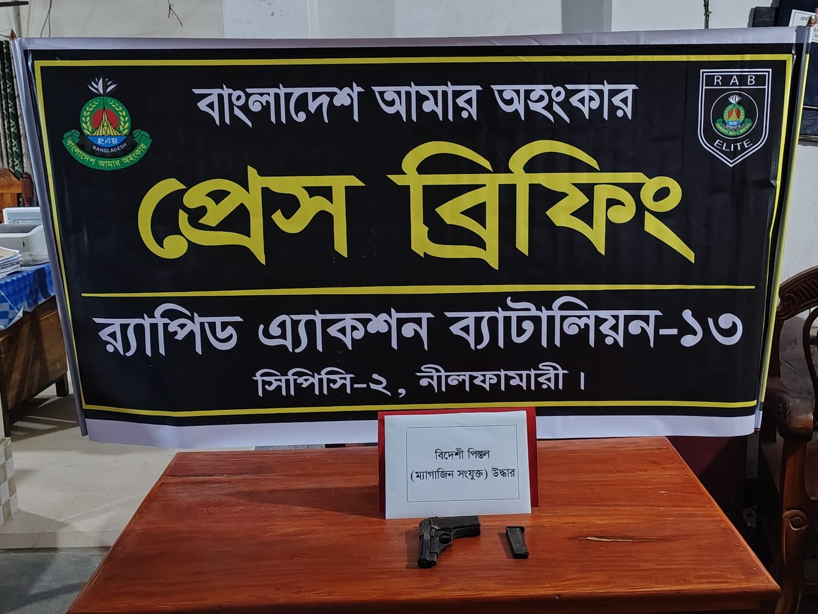 র্যাব জানায়, শুক্রবার (২৩ জানুয়ারি) ভোর রাতে র্যাব-১৩, সিপিসি-২, নীলফামারী ক্যাম্পের একটি আভিযানিক দল জেলার জলঢাকা উপজেলার বালাগ্রাম ইউনিয়নের ৭ নম্বর ওয়ার্ডের অন্তর্গত পূর্ব বালাগ্রাম এলাকায় অভিযান পরিচালনা করে। জলঢাকা–ডালিয়া সড়কের পার্শ্বে অবস্থিত মৃত আছির উদ্দিনের ছেলে তোফাজ্জল (৬০)-এর বাঁশ বাগানে অভিযান চালিয়ে পরিত্যক্ত অবস্থায় একটি হলুদ রঙের শপিং ব্যাগের ভেতর থেকে একটি অবৈধ বিদেশি পিস্তল উদ্ধার করা হয়।