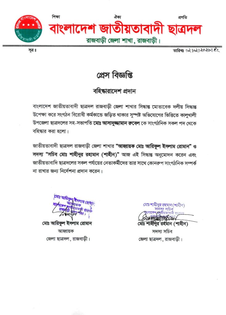 বাংলাদেশ জাতীয়তাবাদী ছাত্রদল রাজবাড়ী জেলা শাখার সিন্ধান্ত মোতাবেক দলীয় সিদ্ধান্ত উপেক্ষা করে সংগঠন বিরোধী কর্মকান্ডে জড়িত থাকার সুস্পষ্ট অভিযোগের ভিত্তিতে কালুখালী উপজেলা ছাত্রদলের সহ-সভাপতি মোঃ আসাদুজ্জামান রুবেল কে সাংগঠনিক সকল পদ থেকে বহিস্কার করা হয়।