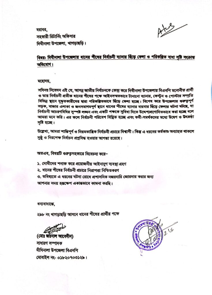 অভিযোগপত্রে উল্লেখ করা হয়, আসন্ন জাতীয় সংসদ নির্বাচনে খাগড়াছড়ি-২৯৮ নং আসনের বিএনপি মনোনীত সংসদ সদস্য প্রার্থী আব্দুল ওয়াদুদ ভাইয়া-এর নির্বাচনী প্রতীক ধানের শীষের পোস্টার, ব্যানার ও ফেস্টুন পরিকল্পিতভাবে ছিঁড়ে ফেলা হচ্ছে। এসব কর্মকাণ্ড সম্পূর্ণ আইনবহির্ভূত এবং নির্বাচনী আচরণবিধির সুস্পষ্ট লঙ্ঘন।