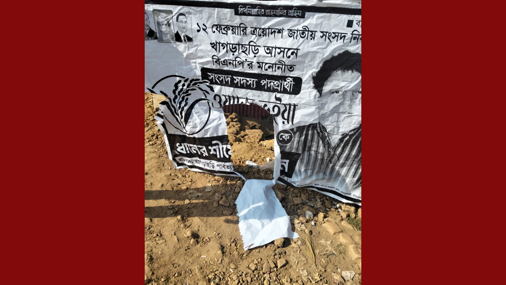 খাগড়াছড়ির দীঘিনালা উপজেলায় বিএনপি মনোনীত প্রার্থীর নির্বাচনী ব্যানার ও ফেস্টুন ছিঁড়ে ফেলা এবং পরিকল্পিতভাবে নির্বাচনী প্রচারে বাধা সৃষ্টি করা হচ্ছে—এমন অভিযোগ উঠেছে। এ ঘটনায় উপজেলা সহকারী ট্রেনিং কর্মকর্তা ও উপজেলা প্রশাসনের কাছে লিখিত অভিযোগ দায়ের করেছেন বিএনপি নেতাকর্মীরা।
