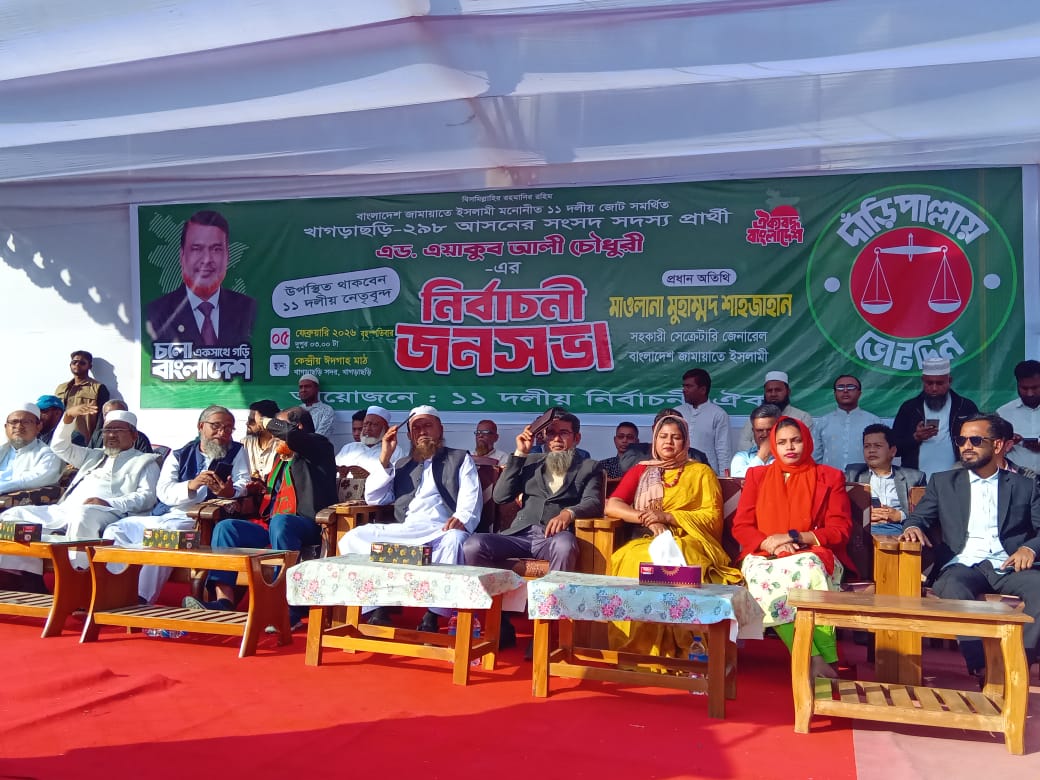 খাগড়াছড়িতে বাংলাদেশ জামায়াতে ইসলামী মনোনীত ও ১১ দলীয় জোট সমর্থিত ২৯৮ নং সংসদীয় আসনের প্রার্থী অ্যাডভোকেট ইয়াকুব আলী চৌধুরীর নির্বাচনী জনসভা অনুষ্ঠিত হয়েছে।