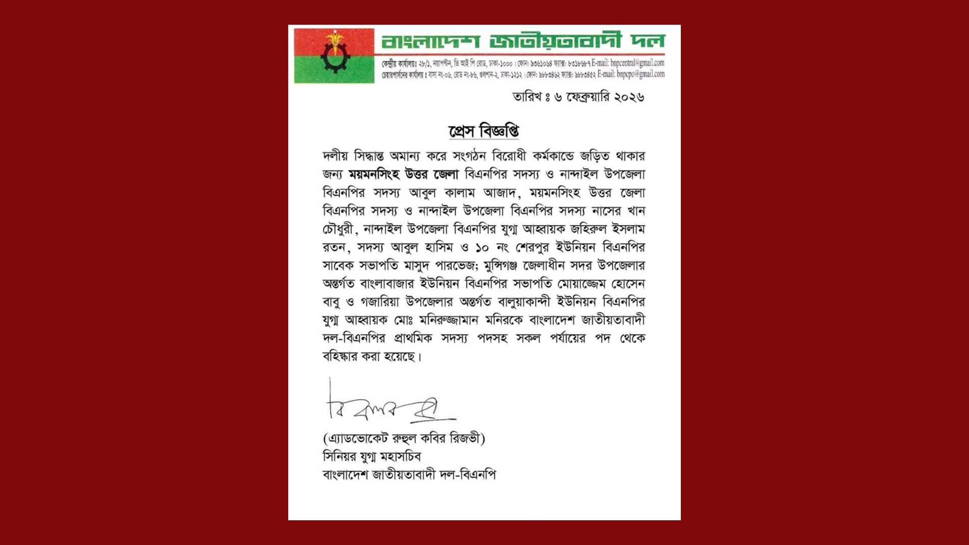 বৃহস্পতিবার (৬ ফেব্রুয়ারি ২০২৬) বিএনপির কেন্দ্রীয় কার্যালয় থেকে পাঠানো এবং সিনিয়র যুগ্ম মহাসচিব এ্যাডভোকেট রুহুল কবির রিজভী স্বাক্ষরিত এক প্রেস বিজ্ঞপ্তিতে এই সিদ্ধান্ত জানানো হয়।
