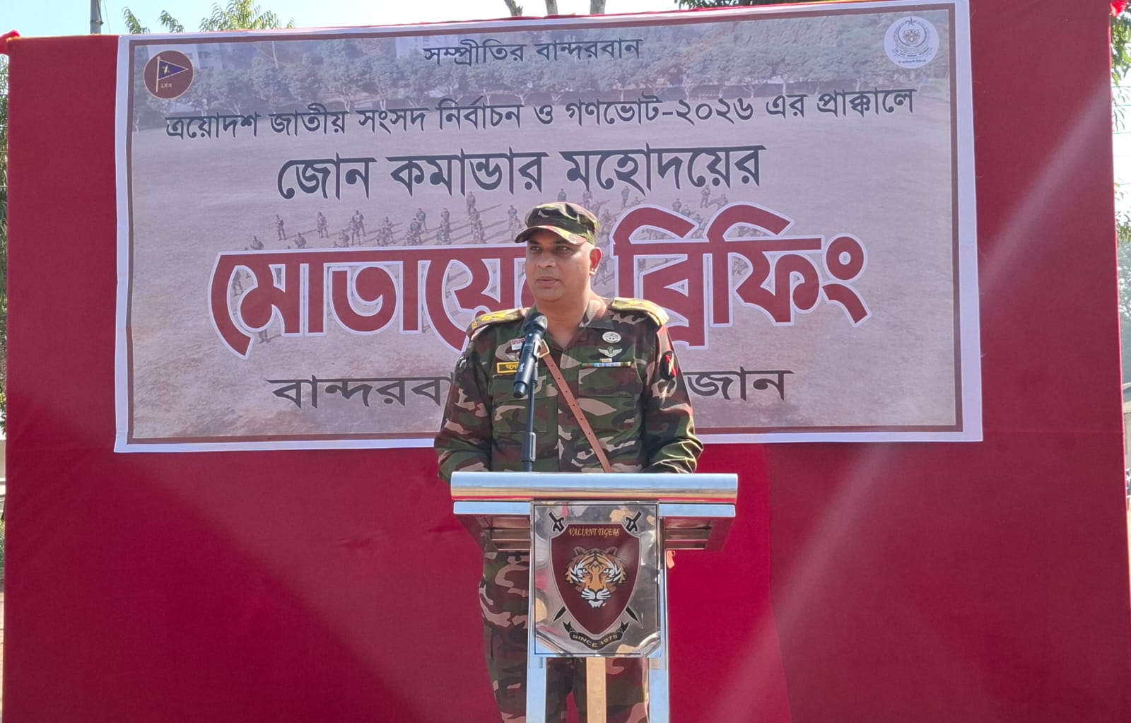এয়োদশ জাতীয় সংসদ নির্বাচন ও গণভোট ২০২৬ উপলক্ষ্যে বুধবার (১১ ফেব্রুয়ারী) সকালে সেনাবাহিনীর বান্দরবান জোন এর আয়োজনে জোন প্রাঙ্গনে বান্দরবানে যৌথবাহিনী মোতায়েন উপলক্ষ্যে এক ব্রিফিং অনুষ্ঠিত হয়েছে।