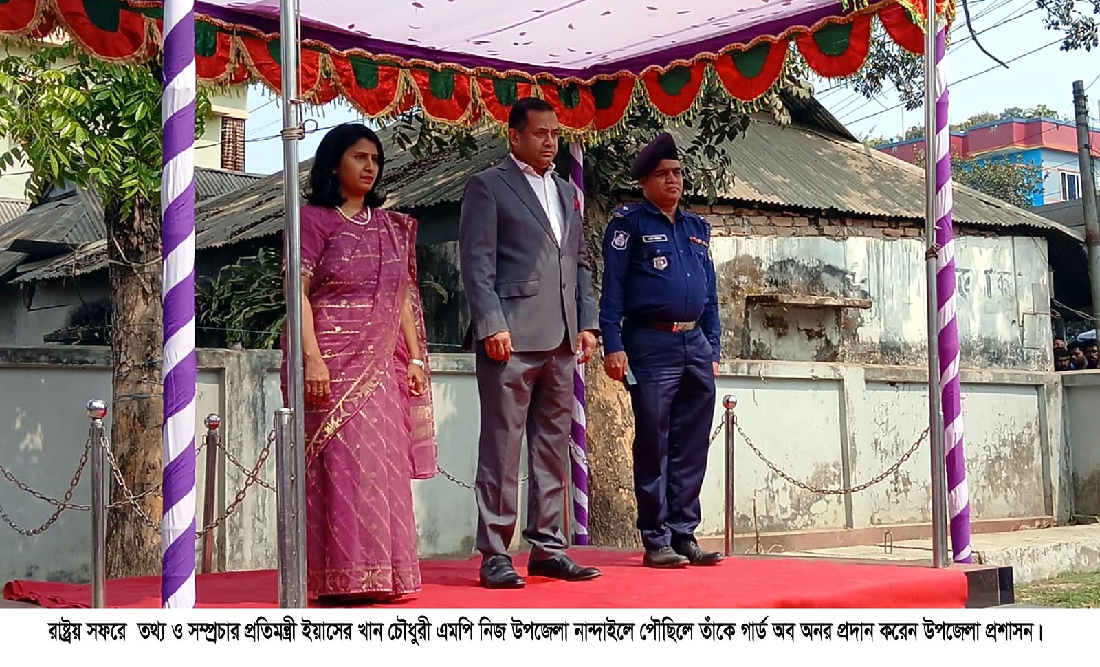 এর আগে সকালে তিনি নান্দাইলে পৌঁছালে উপজেলা প্রশাসনের পক্ষ থেকে তাঁকে গার্ড অব অনার প্রদান করেন উপজেলা নির্বাহী অফিসার ফাতেমা জান্নাত এবং নান্দাইল মডেল থানার অফিসার ইনচার্জ আলআমিন।