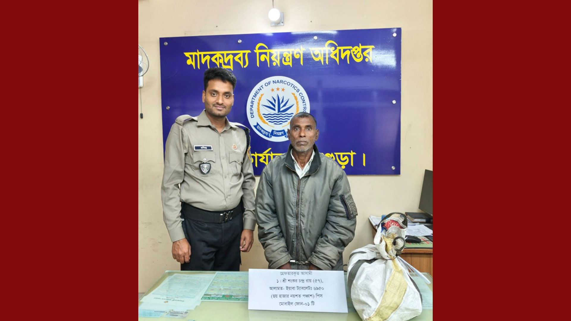 উদ্ধারকৃত মালামালের মধ্যে রয়েছে তিনটি জিপারযুক্ত পলি প্যাকেটে মোট ৬,৯৫০ পিস ইয়াবা ট্যাবলেট (প্রতি প্যাকেটে যথাক্রমে ২,৫০০, ২,৫০০ ও ১,৯৫০ পিস) মাদক ব্যবসায় ব্যবহৃত একটি NOKIA TA-1010 বাটন মোবাইল ফোন (সিমসহ) গ্রেপ্তারকৃত শংকর চন্দ্র রায় গাইবান্ধা জেলার গোবিন্দগঞ্জ থানার শিংজানি গ্রামের বাসিন্দা। তার পিতা মৃত রমেশ চন্দ্র ও মাতা মৃত সরলা বালা।
