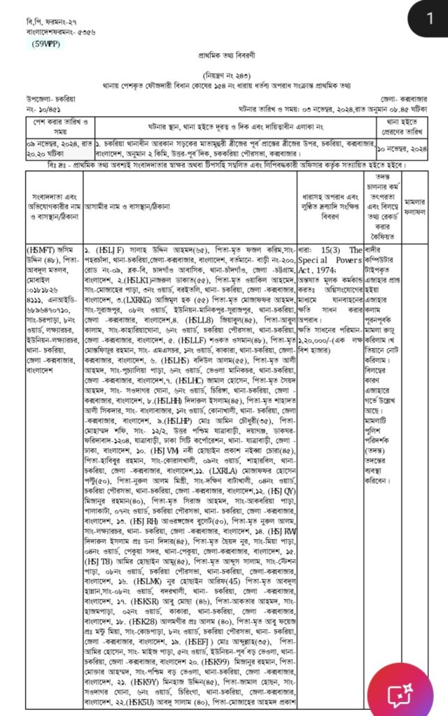 এ ঘটনায় ৯ নভেম্বর জসিম উদ্দিন নামের এক ভুক্তভোগী বাদি হয়ে ১৫৬ জনের নাম উল্লেখ করে এবং ১০০ থেকে ২০০ জনকে অজ্ঞাত রেখে চকরিয়া থানায় ১৫৪ ধারা একটি মামলা দায়ের করেন।