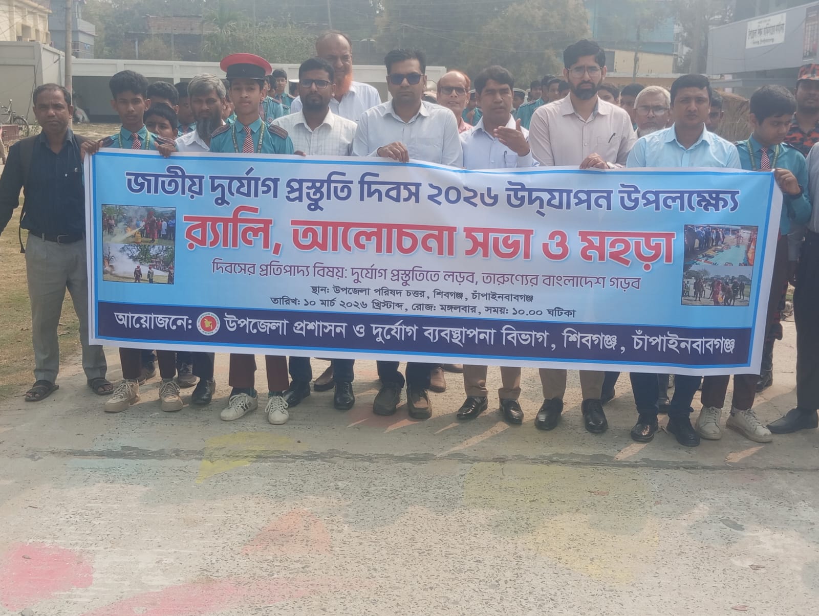 চাঁপাইনবাবগঞ্জ শিবগঞ্জে জাতীয় দুর্যোগ প্রস্তুতি দিবস–২০২৬ উদযাপন করা হয়েছে। “দুর্যোগ প্রস্তুতিতে লড়ব, তারুণ্যের বাংলাদেশ গড়ব” এই প্রতিপাদ্যকে সামনে রেখে উপজেলা প্রশাসন ও দুর্যোগ ব্যবস্থাপনা বিভাগের আয়োজনে শিবগঞ্জ উপজেলা পরিষদ চত্বরে দিবসটি পালন করা হয়।