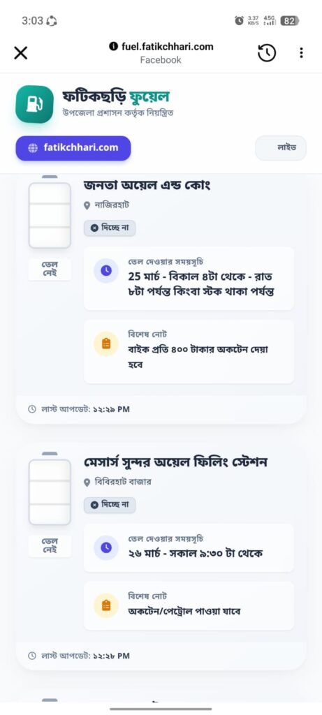 স্মার্টফোনে নির্দিষ্ট ওয়েবসাইটে প্রবেশ করে ‘লাইভ ফুয়েল মনিটরিং সিস্টেম’ ব্যবহার করা যাবে। লিংকে ঢুকলেই দেখা যাবে ফটিকছড়ি উপজেলার কোন পাম্পে বর্তমানে তেল পাওয়া যাচ্ছে, কোথায় পাওয়া যাচ্ছে না।