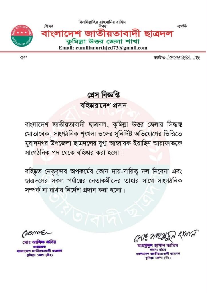 এতে বলা হয়েছে, দলীয় সিদ্ধান্ত অমান্য করে সংগঠন বিরোধী অসামাজিক কর্মকাণ্ডে জড়িত থাকা ও গ্রামের সর্বজন ব্যাক্তিবর্গের সাথে বেয়াদবি মূলক আচরণ করার তথ্য প্রমাণের ভিত্তিতে কুমিল্লা জেলার মুরাদনগর উপজেলার ছাত্রদলের যুগ্ম আহ্বায়ক মো. ইয়াসিন আরাফাতকে বাংলাদেশ জাতীয়তাবাদী ছাত্রদলের প্রাথমিক সদস্য পদসহ সকল পর্যায়ের পদ থেকে বহিস্কার করা হয়েছে।