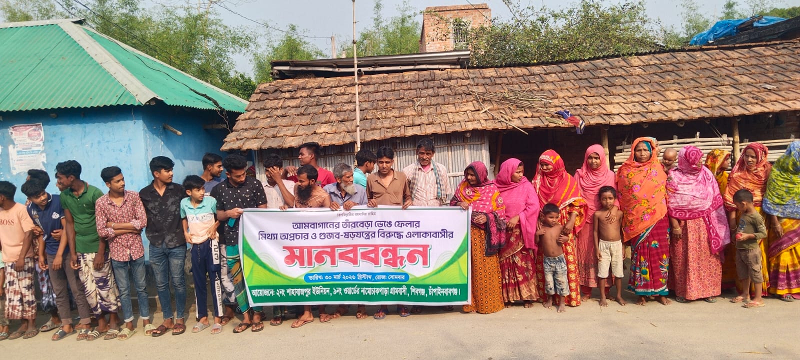 চাঁপাইনবাবগঞ্জ জেলার শিবগঞ্জ উপজেলার শাহাবাজপুর ইউনিয়নের ৯নং ওয়ার্ডের নামোচাকপাড়া গ্রামবাসীর উদ্যোগে আমবাগানের তারবেড়া ভাঙচুর সংক্রান্ত কথিত গুজব ও অপপ্রচারের প্রতিবাদে মানববন্ধন অনুষ্ঠিত হয়েছে।