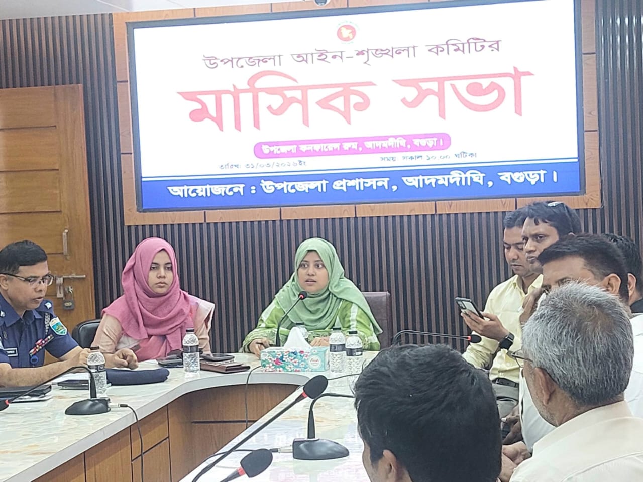 বগুড়ার আদমদিঘী উপজেলার আইন-শৃঙ্খলা কমিটির মাসিক সভা অনুষ্ঠিত হয়েছে। মঙ্গলবার বেলা সাড়ে ১১টায় উপজেলা সভাকক্ষে উপজেলা নির্বাহী অফিসার মাসুমা বেগমের সভাপতিত্বে সভায় উপস্থিত ছিলেন আদমদিঘী উপজেলা সহকারী কমিশনার (ভুমি) মাহমুদা সুলতানা, থানার ওসি কামরুজ্জামান মিয়া, উপজেলা সিনিয়র মৎস্য কমকর্তা নাহিদ হোসেন, প্রাণিসম্পদ কর্মকর্তা বেনজির রহমান, কৃষি কমকর্তা রবিউল ইসলাম, উপজেলা প্রকৌশলী রিপন কুমার, ছাতিয়ানগ্রাম ইউপির প্যানেল চেয়ারম্যান মহির উদ্দিন তালুকদার, নশরতপুর ইউপির চেয়ারম্যান গোলাম মোস্তফা, চাপাপুর ইউপির প্যানেল চেয়ারম্যান আনোয়ার হোসেন হিটলু, আদমদিঘী উপজেলা প্রেসক্লাবের সভাপতি বীর মুক্তিযোদ্ধা হাফিজার রহমান, সাধারণ সম্পাদক মেহেদী হাসান, উত্তরাঞ্চল সাংবাদিক ইউনিয়নের সভাপতি মোঃ মনসুর আলী, সান্তাহার প্রেসক্লাবের সাংবাদিক ও সা: সম্পাদক সাগর খাঁন সহ প্রমুখ উপস্থিত ছিলেন।