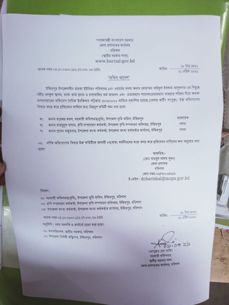 উজিরপুর উপজেলা নির্বাহী কর্মকর্তা মোঃ আলী সুজা জানান, জেলা প্রশাসকের কার্যালয় থেকে তদন্ত কমিটির চিঠি পাওয়া গেছে এবং কমিটির সদস্যরা সুষ্ঠু ও নিরপেক্ষভাবে তদন্ত কার্যক্রম পরিচালনা করে দ্রুত প্রতিবেদন দাখিল করবেন।