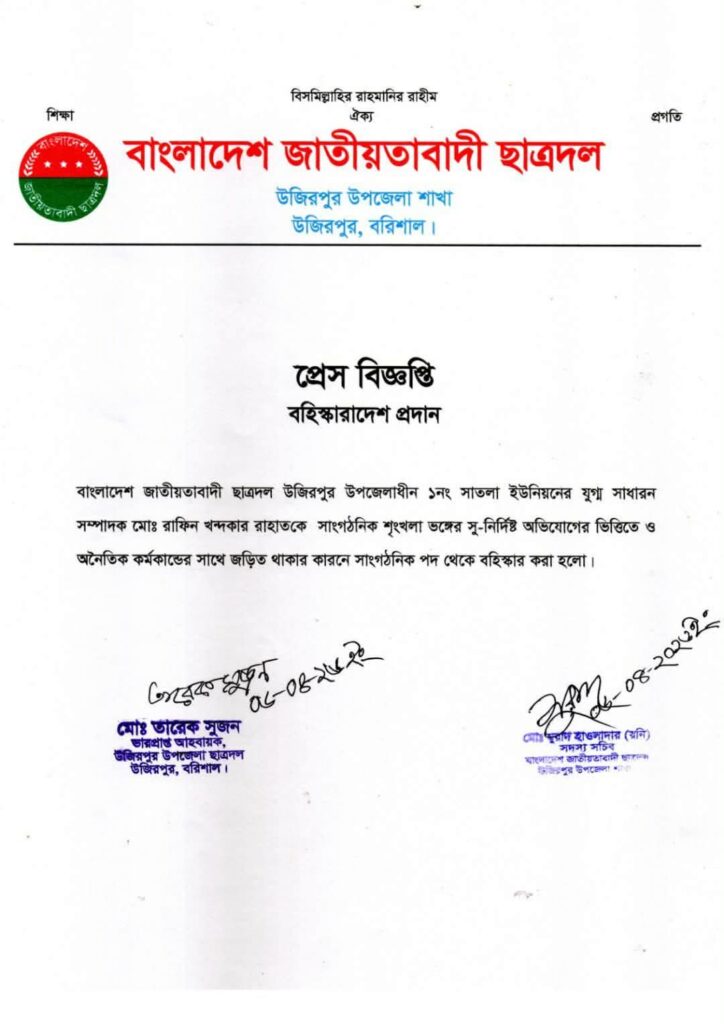 ঘটনার পর উজিরপুর উপজেলা ছাত্রদল এক প্রেস বিজ্ঞপ্তিতে জানায়, সাংগঠনিক শৃঙ্খলা ভঙ্গ ও অনৈতিক কর্মকাণ্ডে জড়িত থাকার অভিযোগে রাহাত খন্দকারকে সংগঠন থেকে বহিষ্কার করা হয়েছে। স্থানীয় একাধিক সূত্রের দাবি, তার বিরুদ্ধে এলাকায় মাদকের পাইকারী ও খুচরা ব্যবসার অভিযোগও রয়েছে।