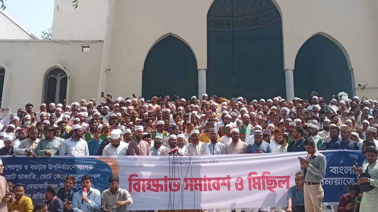 শেরপুরের স্থগিত আসন এবং বগুড়ার উপনির্বাচনে ব্যাপক অনিয়ম, ভোট ডাকাতি, কেন্দ্র দখল ও সহিংসতার অভিযোগ তুলে রাজধানী ঢাকায় বিক্ষোভ সমাবেশ ও মিছিল করেছে জামায়াতে ইসলামী।