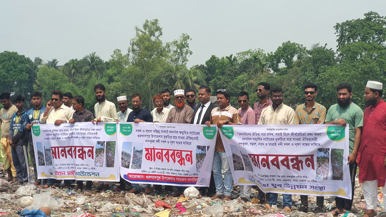 দখল আর দূষণের কবলে অস্তিত্ব সংকটে পড়া নাটোরের গুরুদাসপুরে বুক চিরে বয়ে যাওয়া নন্দকুঁজা নদী বাঁচাতে মানববন্ধন অনুষ্ঠিত হয়েছে। শুক্রবার (১০ এপ্রিল) সকাল ১১ টার দিকে উপজেলার পৌর সদরের চাঁচকৈড় নতুন গরুহাটা সংলগ্ন নন্দকুঁজা নদীর পাড়ে এ মানববন্ধন কর্মসূচী অনুষ্ঠিত হয়। সচেতন নাগরিক ফোরাম, প্রতিভা যুব উন্নয়ন সংস্থা ও জীবন সঙ্গী ফাউন্ডেশন ব্যানারে এ কর্মসূচিতে অংশ নেন এলাকার পরিবেশকর্মী ও সচেতন যুবসমাজ।