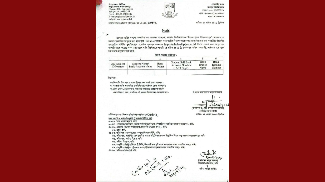 বিশ্ববিদ্যালয়ের রেজিস্ট্রার দপ্তর থেকে জারি করা এক বিজ্ঞপ্তিতে জানানো হয়, ‘বিশেষ বৃত্তির নীতিমালা-২৫’ অনুযায়ী যেসব শিক্ষার্থী পূর্বে অনলাইনে আবেদন করে বিভাগীয়ভাবে মনোনীত হয়েছেন, তাদের নির্ধারিত ওয়েবসাইটে (https://scholarship.jnu.ac.bd�) প্রবেশ করে ব্যাংক হিসাবসংক্রান্ত প্রয়োজনীয় তথ্য সঠিকভাবে পূরণ করতে হবে।