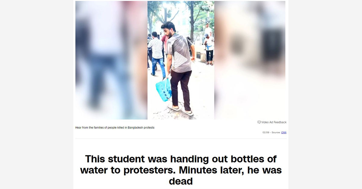 পানি বিতরনের মাত্র ১৫ মিনিটের মাথায়, দুপুরের উত্তাপে বিশ্রাম নেওয়ার সময় একটি বুলেট তার কপালে এসে বিঁধে; শহীদ হন বিশ্ববিদ্যালয় শিক্ষার্থী মুগ্ধ। মার্কিন সংবাদমাধ্যম সিএনএন মুগ্ধর মৃত্যুর এমন বর্ণনা দিয়ে তাকে নিয়ে সোমবার (১২ আগস্ট) এক প্রতিবেদন প্রকাশ করেছে।
