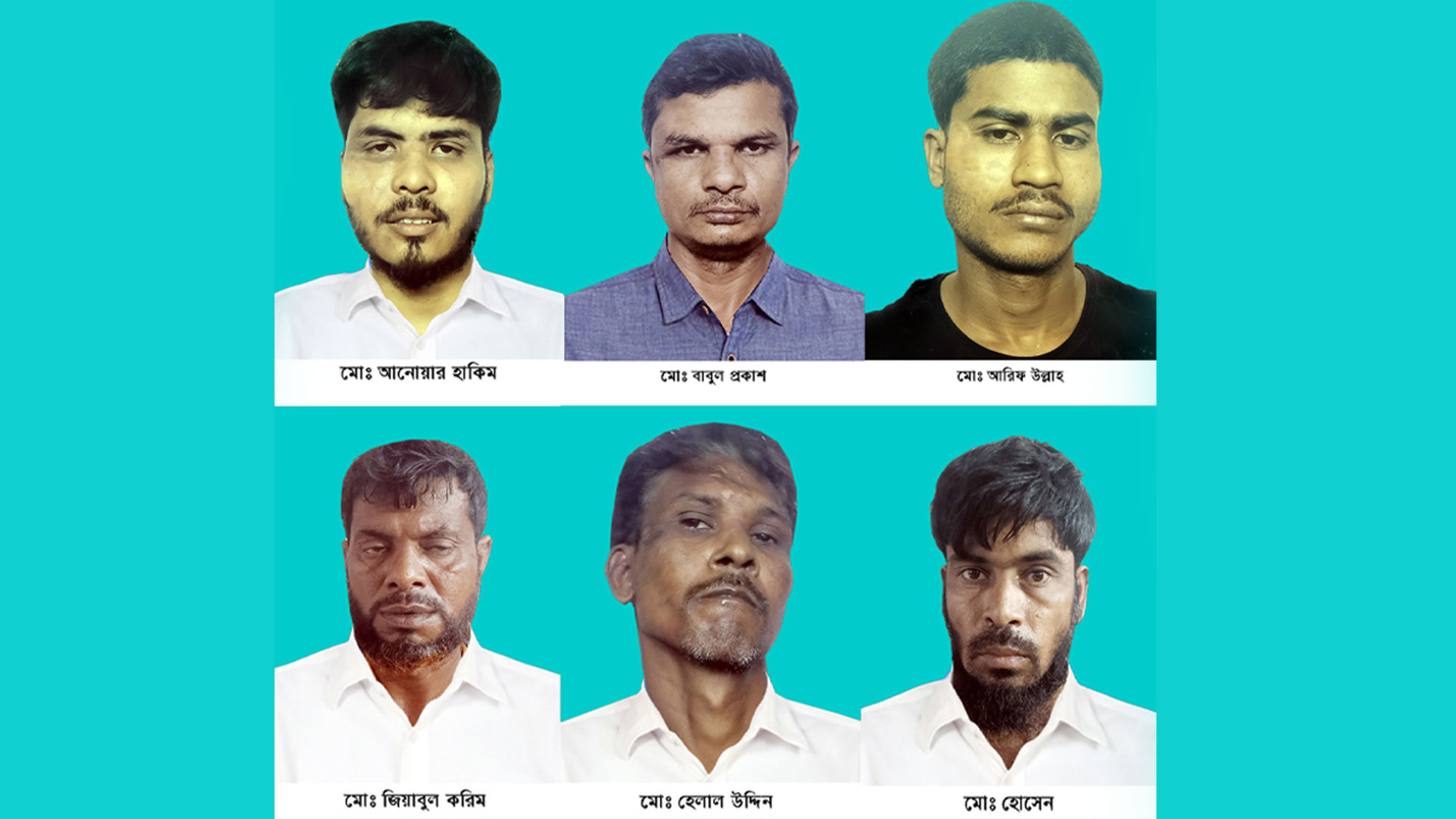 আটকরা হলেন- মো. বাবুল প্রকাশ (৪৪), মো. হেলাল উদ্দিন (৩৪), মো. আনোয়ার হাকিম (২৮), মো. আরিফ উল্লাহ (২৫), মো. জিয়াবুল করিম (৪৫) এবং মো. হোসেন (৩৯)।