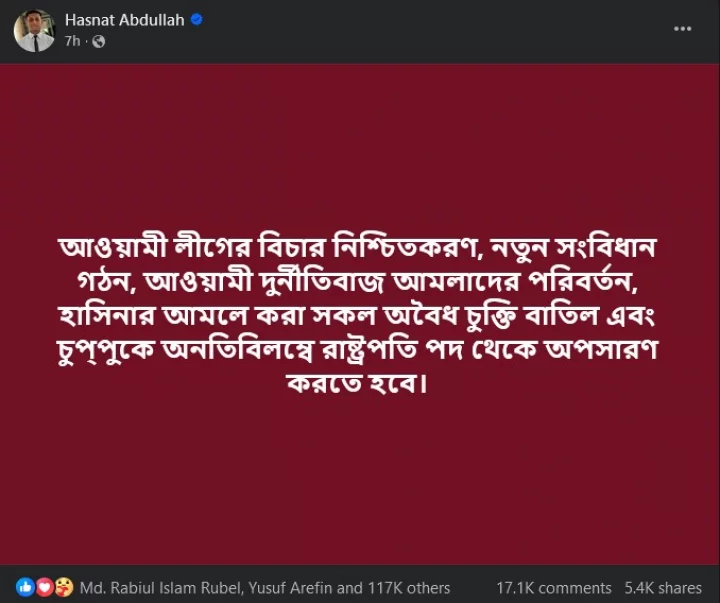 এর আগে হাসনাত আব্দুল্লাহ ফেসবুক পোস্টে লেখেন, ‘আওয়ামী লীগের বিচার নিশ্চিতকরণ, নতুন সংবিধান গঠন, আওয়ামী দুর্নীতিবাজ আমলাদের পরিবর্তন, হাসিনার আমলে করা সকল অবৈধ চুক্তি বাতিল এবং চুপ্পুকে অনতিবিলম্বে রাষ্ট্রপতি পদ থেকে অপসারণ করতে হবে।’