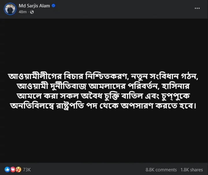 তিনি পোস্টে লিখেন, ‘আওয়ামী লীগের বিচার নিশ্চিতকরণ, নতুন সংবিধান গঠন, আওয়ামী দুর্নীতিবাজ আমলাদের পরিবর্তন, হাসিনার আমলে করা সকল অবৈধ চুক্তি বাতিল এবং চুপ্পুকে (রাষ্ট্রপতি সাহাবুদ্দিন) অনতিবিলম্বে রাষ্ট্রপতি পদ থেকে অপসারণ করতে হবে।’
