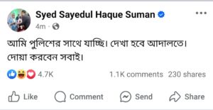 স্ট্যাটাসে ব্যারিস্টার সুমন লিখেছেন, আমি পুলিশের সাথে যাচ্ছি। দেখা হবে আদালতে।দোয়া করবেন সবাই।