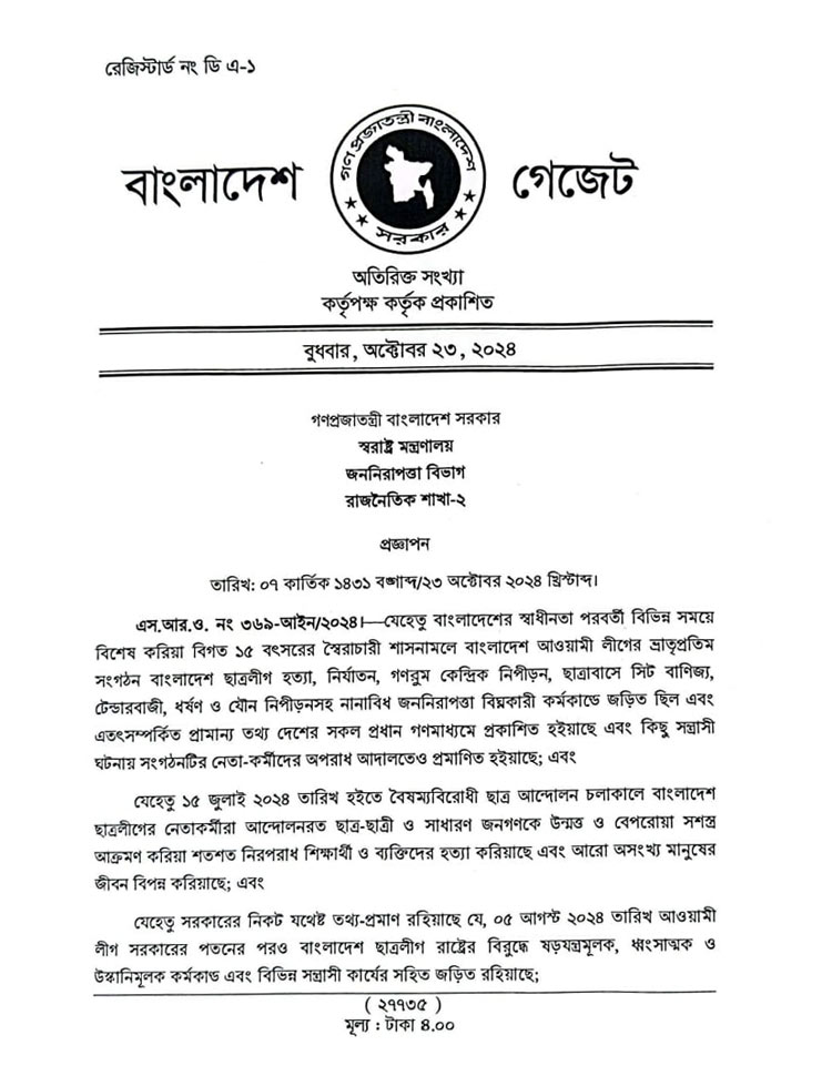 গেজেটে বলা হয়েছে, বাংলাদেশের স্বাধীনতা পরবর্তী বিভিন্ন সময়ে বিশেষ করে গত ১৫ বছরে স্বৈরাচারী শাসনামলে বাংলাদেশ আওয়ামী লীগের ভ্রাতৃপ্রতীম সংগঠন বাংলাদেশ ছাত্রলীগ হত্যা, নির্যাতন, গণরুমকেন্দ্রিক নিপীড়ন, ছাত্রাবাসে সিট বাণিজ্য, টেন্ডারবাজি, ধর্ষণ ও যৌন নিপীড়নসহ নানাবিধ জননিরাপত্তা বিঘ্নকারী কর্মকাণ্ডে জড়িত ছিল। এ সম্পর্কিত প্রামান্য তথ্য দেশের সব প্রধান গণমাধ্যমে প্রকাশিত হয়েছে এবং কিছু সন্ত্রাসী ঘটনায় সংগঠনটির নেতাকর্মীদের অপরাধ আদালতেও প্রমাণিত হয়েছে।