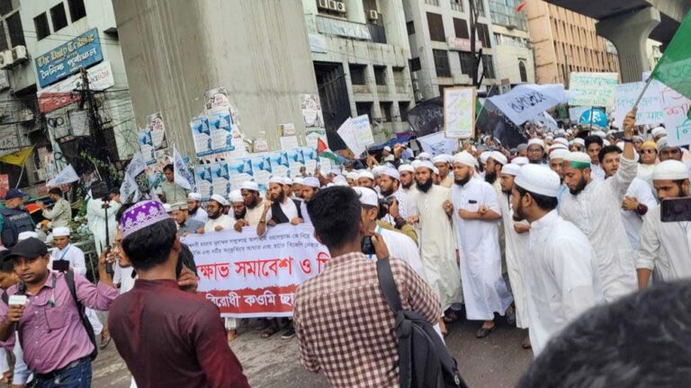 বৈষম্যবিরোধী কওমি ছাত্র ঐক্য পরিষদ ও বাংলাদেশ খেলাফত মজলিস বিশ্বনবী হজরত মুহাম্মদকে (সা.) নিয়ে ভারতীয় পুরোহিতের কটূক্তি ও ধর্মীয় অনুভূতিতে আঘাত এবং তাতে বিজেপি নেতার সমর্থনের প্রতিবাদে রাজধানীতে বিক্ষোভ মিছিল