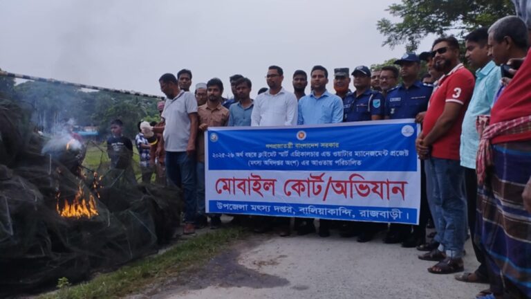 মোঃ আমিরুল হক, রাজবাড়ী প্রতিনিধি: ২০২৫-২৬ অর্থ বছরে ক্লাইমেট স্মার্ট এগ্রিকালচার এন্ড ওয়াটার ম্যানেজমেন্ট প্রজেক্ট (মৎস অধিদপ্তর অংশ) এর আওতায় রাজবাড়ীর বালিয়াকান্দিতে মোবাইল কোর্ট পরিচালনা করা হয়েছে। মোবাইল কোর্টে ১০