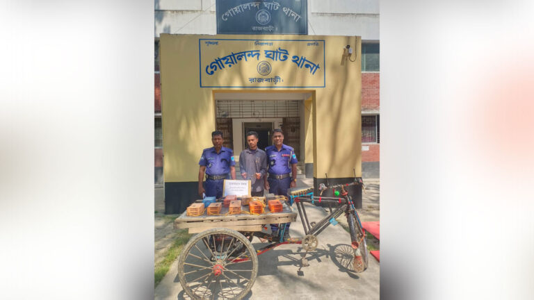মোঃ আমিরুল হক, রাজবাড়ী প্রতিনিধি: রাজবাড়ীর গোয়ালন্দে বিশেষ অভিযান চালিয়ে চুরি হওয়া একটি ব্যাটারিচালিত ভ্যান ও ৯টি ভ্যানের চার্জারসহ মোঃ সোহান শেখ (২১) নামে এক ব্যক্তিকে গ্রেপ্তার করেছে থানা পুলিশ।