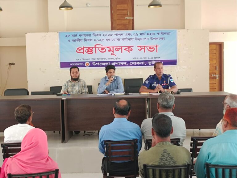 মোঃ নুর আলম পাপ্পু, খোকসা (কুষ্টিয়া) প্রতিনিধিঃ খোকসা উপজেলা প্রশাসনের উদ্যোগে ২৫ মার্চ গণহত্যা দিবস এবং ২৬ মার্চ মহান স্বাধীনতা ও জাতীয় দিবস ২০২৫ যথাযোগ্য মর্যাদায় উদযাপন উপলক্ষে এক প্রস্তুতিমূলক