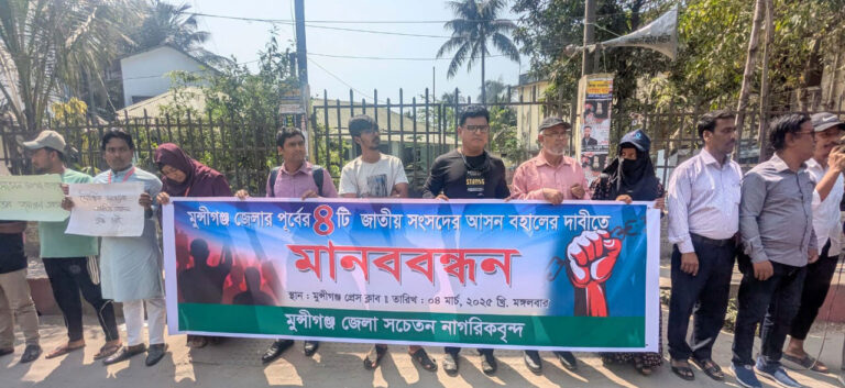 তোফাজ্জল হোসেন শিহাব, মুন্সিগঞ্জ প্রতিনিধিঃ মুন্সীগঞ্জের সংকুচিত সংসদীয় আসনের যৌক্তিক সংখ্যাবৃদ্ধির দাবিতে মানববন্ধন কর্মসূচি পালিত