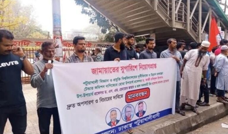জাকির হোসেন হাওলাদার, দুমকী ও পবিপ্রবি প্রতিনিধি : রাজধানীর জাতীয় প্রেস ক্লাব–এর সামনে পটুয়াখালী বিজ্ঞান ও প্রযুক্তি বিশ্ববিদ্যালয়ের (পবিপ্রবি) উপাচার্য, উপ-উপাচার্য ও এক অধ্যাপকের অপসারণসহ ১৪ দফা দাবিতে মানববন্ধন কর্মসূচি