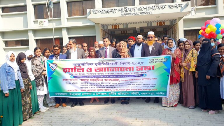 মোঃ নাঈম ইসলাম, গুরুদাসপুর (নাটোর) প্রতিনিধি: আন্তর্জাতিক দুর্নীতি বিরোধী দিবস-২০২৫ ও আন্তর্জাতিক নারী দিবস উপলক্ষে নাটোরের গুরুদাসপুরে র্যালি ও আলোচনা সভা অনুষ্ঠিত হয়েছে। আজ (০৯