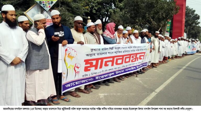 বাউল শিল্পী আবুল সরকারের ফাঁসির দাবিতে নান্দাইলে ইত্তেফাকুল উলামার মানববন্ধন